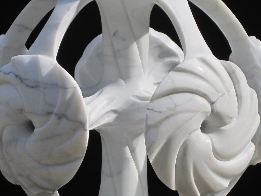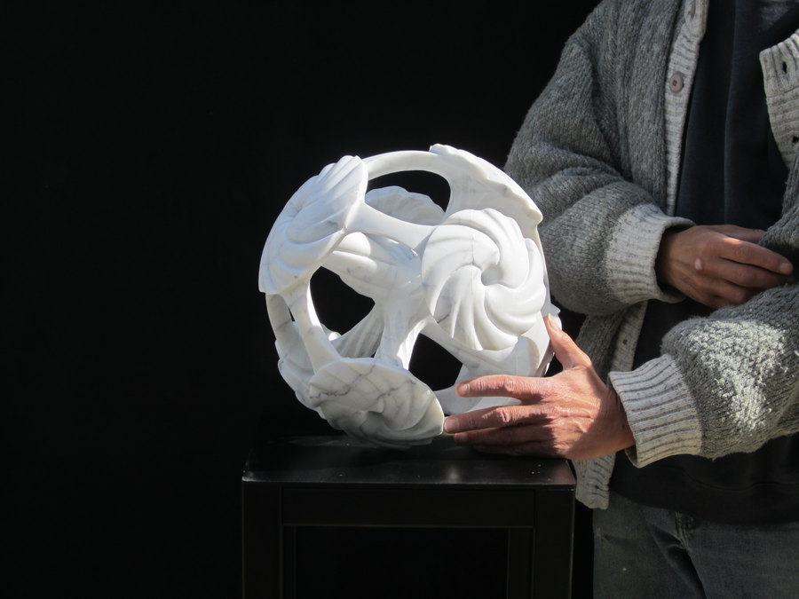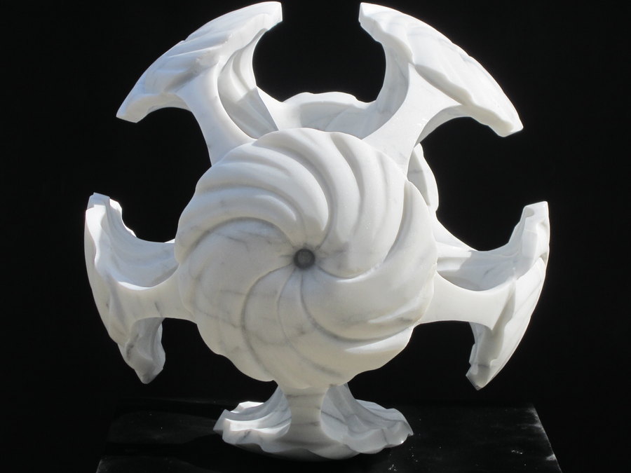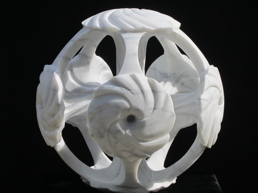 mandala sperique comprenant les 7 chakras taillé dans la masse en marbre de carrare d'un diametre de 32 cm